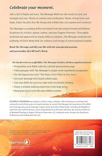 Celebrate your moment. Life is full of highs and lows. The Message Bible has the words to carry you through each one. Words of comfort and celebration. Words of heartache and hope. Enjoy the gifts that life brings and a Bible that can express each moment.