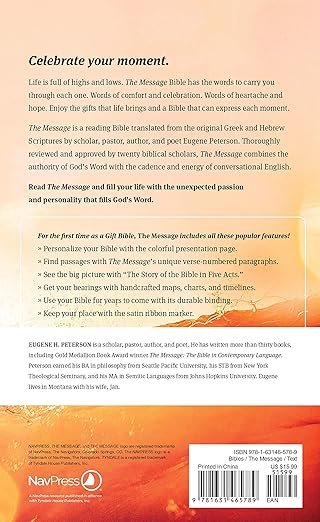 Celebrate your moment. Life is full of highs and lows. The Message Bible has the words to carry you through each one. Words of comfort and celebration. Words of heartache and hope. Enjoy the gifts that life brings and a Bible that can express each moment.